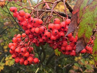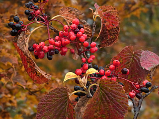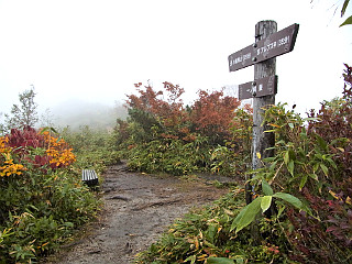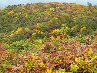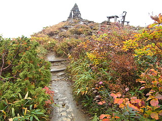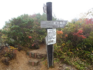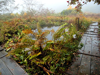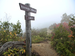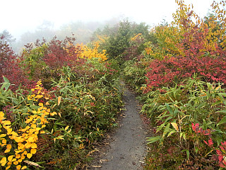 | 山行記 | ●山でも多くの人出を記録したシルバーウィークの翌週、アルプスの紅葉を見るために、山仲間と出かけることになった。さすがに高速道路もサービスエリアも平日かと思う程空いている。 ●しかし、天気の方はというと、予報では曇りから晴れに変わるということだが、雲が厚く、おまけに梓川SAでは霧のような雨が降り出した。とりあえず現地まで行って判断しようと、登山口の五竜遠見テレキャビン乗場まで行ってみることにした。 ●テレキャビン乗場に着いたが、雨は降っていないのでテレキャビンで上まで行ってみることにした。終点のアルプス平に着いたとき霧のような雨が降り出し、リフトに乗ると本格的な雨に変わった。 ●とりあえずカッパを着て、登るのか断念するのかを話し合ったが、せっかく来たのだからとにかく行ってみて、状況を見て引き返すなら引き返そうということになった。 ●登山道はリフト終点から木道を歩く、登山道に入るとすぐ地蔵ノ頭経由と地蔵ノ沼経由の道に分かれるので緩やかそうな地蔵ノ池経由で行くことにした。雨は降ったり止んだりで、明るくなるときもあるが、天候は一向に回復しない。 ●地蔵ノ池周辺は、霧の中、ナナカマドなどの紅葉がいい感じだ。タムラソウやミヤマアキノキリンソウ、オヤマボクチ、タテヤマウツボグサなどの花もまだ咲いている。 ●地蔵ノ頭からの道と合流すると、木の階段が多い尾根道を歩くようになる。少し行くと見返り坂に着くが、もちろん振り返ってもガスが見えるだけで何も見えない。 ●見返り坂の先から尾根はやや急になり、階段のステップも大きくなるので大変だ。途中ベンチのある広場があるが、そこが次の一ノ背髪かと思いがっかりする。一ノ背髪まではまだしばらく急な坂と急な階段を登らなければならない。 ●そして五竜岳の展望ポイントである一ノ背髪に着くが、相変わらずのガスで何も見ることはできない。それでも、高度を上げるにつれ紅葉は鮮やかさを増し、霧の中の紅葉も一味違っていてなかなかいい。 ●一ノ背髪を過ぎると、開けた尾根道を歩くようになり、傾斜も緩やかな気持ちのいい道になる。これで天気がよければすばらしい展望が得られることだろうが残念だ。 ●一ノ背髪から紅葉を楽しみながら歩くと、意外に早く二ノ背髪に着く。天気がよければ二ノ背髪付近から小遠見山の山頂も見ることができるはずだ。 ●稜線を更に進むと、五竜岳への縦走路と小遠見山山頂に行く道との分岐に出るので、小遠見山山頂方面へ少し登れば、小広場になっている小遠見山山頂だ。 ●山頂には、大人数の賑やかなグループが2組陣取っていたが、こちらも空いていたベンチで休憩をすることにした。時折明るくなる時もあるので天気の快方を期待したが、結局諦めて下山をすることにした。 ●帰りは地蔵ノ頭へ寄り、リフト終点からはリフトに乗らず、白馬五竜高山植物園のまだ咲き残る高山植物を楽しみながらテレキャビンのアルプス平駅まで戻った。 |