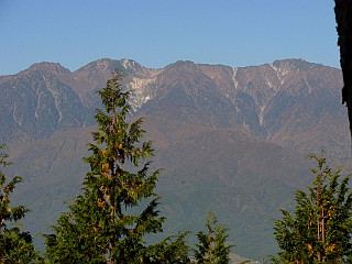 | 山行記 | ●天気予報は上々なこの日、千mそこそこの山では紅葉はまだだと思ったが、展望さえあればいいと思い、展望が自慢のこの山を訪れた。しかし、中央自動車道の恵那山トンネルを越えると、雲が多く嫌な感じだ。 ●松川ICで自動車道を下り、リンゴ農園が立ち並ぶ一般道を走って登山口を目指す。ガイドブックで確認した登山口だが、カーナビの情報では探せなかったので、いろいろ迷いながら何とか登山口に到着。路肩に車を駐車して出発する。 ●登山道はもっと下から続いているようで、しっかりとした道標が立てられており、その出会い付近に駐車したが、そこから少し下った所がさらに上へ登るための入口だ。入口には、クマの目撃情報の看板が取り付けられていた。 ●アカマツ林の中に付けられた登山道は、車が通ることができる程の広い道だが、結構傾斜がある。登り始めてすぐベンチのある展望所が現れるが、そこからは少し木々が邪魔をするものの、空木岳や南駒ヶ岳、恵那山などを見ることができた。 ●さらに登ると、1回目の舗装された車道に出るのでそれを渡って再び広い登山道を進む。2回目の舗装道を渡ると広い登山道はすぐ行き止まりとなり、右手に続く普通の幅の登山道を登り始める。九十九折れの掘割状の道は、3回目の舗装道に突き当たる。 ●舗装道の法面にはリュウノウギクやフトボナギナタコウジュが群生していた。その舗装道を少し登り、案内に従って再び登山道に入る。登山道には、丸太を使った立派な手摺が付けられていた。 ●少し登ると、4回目の舗装道に出会う。この辺りの、青空をバックに見る紅葉はいい感じで、中央アルプスの宝剣岳や千畳敷を望むことができた。 ●いつの間にか林相は自然林へと変わり、太陽光を透かした紅葉が美しい。傾斜もしだいに急になり、それが一段落すると「丸尾のブナ」と呼ばれる大きなブナの木に出会う。推定樹齢600年ともいわれる巨木はパワーを感じる。 ●ブナから再び急になる道を登ると鉄塔が見えてくる。間もなく5回目の舗装道に出て、すぐに鉄塔への道と交差する6回目の林道に出合うが、今度はその舗装道を少し歩く。舗装道からは、仙丈ヶ岳や鋸岳などを間近に見ることができた。 ●やがてキャンプ場への分岐に出るが、そこからの南アルプスの眺めが良く、間ノ岳や塩見岳、荒川岳、赤石岳、聖岳などが一望できる。分岐は近道になるキャンプ場方面へ進む。 ●キャンプ場は芝生の広場で、眼前には中央アルプスが一望できる絶好の場所だ。山頂へはキャンプ場奥の鉄塔横から木の階段を登ればすぐだ。 ●展望が自慢の陣馬形山山頂からは、西に天竜川の流れる伊那谷を隔てて中央アルプスが屏風のように立ち上がり、南の方には恵那山や大川入山、蛇峠山まで見ることができる。東には仙丈ヶ岳、白峰三山、塩見岳、荒川赤石、聖岳などを前衛峰越しに見ることができた。 ●また、山頂には無料で見ることができる双眼鏡が設置されており、中央アルプスの山小屋や美ケ原王ヶ頭や蛇峠山山頂のの鉄塔群などもはっきりと確認することができた ●車で山頂近くまで来ることができる山なので、山の格好をしていない人も多かったが、滞在在時間が短く、やはり、下から登ったものでなければ解らない何かがあるのだろうか。 ●暑くも無く寒くも無く、青空と大展望で、いつまで居ても飽きないところが、後ろ髪を引かれながらも下山することにした。下山は、来た道を戻り、望岳荘で汗を流し、IC近くでリンゴを買って、帰路についた。 |
