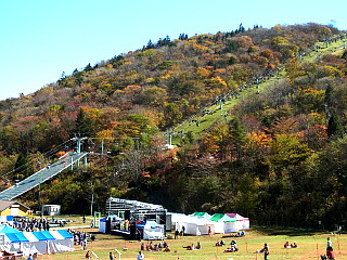 | 第2駐車場からイベント会場へ下る | 色付く萩太郎山の山肌 | イベントで行われた森野熊八料理ショウ |