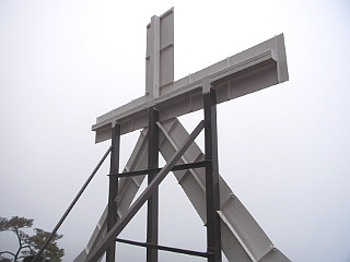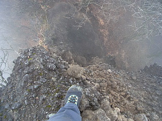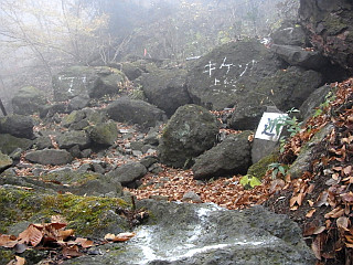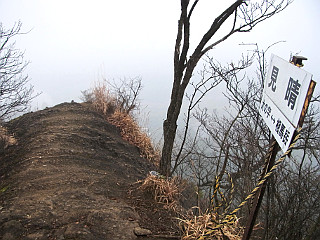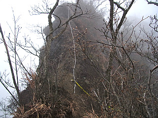 | 岩が濡れている嫌な感じの鎖場 | ガスで視界の無い「見晴」 | ビビリ岩上部から下を見る |
