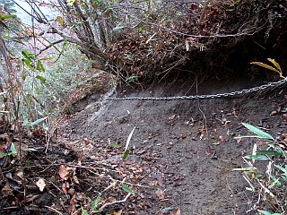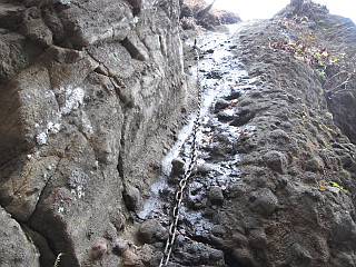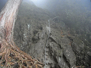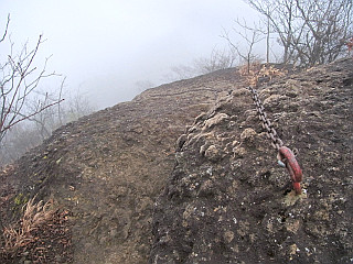 | 霧と露で濡れた悪コンディションの岩と鎖の山を登る | ||