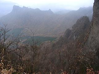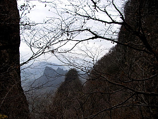 | 山行記 | ●岩と鎖の殿堂であるこの妙義山は、200名山でもあり一度は登ってみたい山の一つだった。たまたま今年は、戸隠西岳や大キレットに登ってきたこともあり、そんな年の閉めとして登っておきたかった。 ●この3連休は、1日目に飲む機会があったので、2日目中に現地まで行き、3日目の早朝から登る計画だったが、どうも天気が思わしくない。岩と鎖の山を雨の中登るのは危険すぎるので迷っていたが、天気予報もどうやら雨は降らないようなので、出かけてみることにした。 ●昼過ぎ、余裕をもって豊川を出たが、上信越道がヘリの墜落事故の影響で通行止め。仕方がないので混雑する軽井沢を通って何とか道の駅みょうぎに着くことができた。道の駅みょうぎで仮眠し、翌朝、市営第2駐車場へ車を移動して出発した。 ●人気のない、まだ暗さの残る妙義神社の参道を登る。神社ならではの石段が続きいきなり大変だが、我慢して登ると妙義神社の本殿前に着くので、道中の安全をお願いしてから本殿の右手から始まる登山道入口へ進む。 ●登山道入口は現在工事中で、仮設の歩道橋を渡って登山道へ入る。暗い樹林の中の急登を登っていくと最初の鎖場が現れる。難易度は高いとは言えないが、露なのか霧なのか、微妙に濡れていて嫌らしい。 ●さらに登ると、再び濡れた鎖場があり、それを登り切ると大の字の基部に出る。本道は右へ続くのだが、せっかくなので大の字にも登っていくことにする。 ●大の字へは、垂直に近い岩を鎖を頼りにしながら登るわけだが、規則的に岩にステップが付けられているので、取り付き以外は困ることはないが、微妙に濡れている岩が嫌な感じだ。大の字の上からは展望が広がるはずだが、残念ながらこの辺りは霧に包まれていて、僅かに妙義神社周辺が霞んで見える程度だった。 ●大の字から下りると、先程の分岐を本道へ進む。樹林の中の急登を登り切ると、「辻」と表示された分岐に出る。ここは、中間道の第一見晴へ向かう道との分岐になっており、ここから先は危険な上級コースであるということが岩にペンキで書かれている。 ●「辻」から鎖場や階段状に石が削られた急な道を登っていくと、奥の院に到着する。その右手に立ち上がる岩場がこのコース屈指の難易度を誇る、30mのほぼ垂直の鎖場で、先行の2人連れが、大声で指示を出しあって登ってくのが見えた。 ●落石を警戒して安全なところで待機し、先行が通過したのを確認して、岩に取り付く。最初はどこに取り付くのか迷ったが、登ってみると、一部を除いてステップもホールドも豊富で、一歩一歩冷静にそれを見極めながら登れば恐怖感はない。 ●奥の院の鎖場を登り切るとまたまた鎖場が現れる。大岩の段に沿って登るものだが、濡れているので見た目不安になるが、登ってみるとそれ程でもない。以降、急な痩せた尾根の岩を攀じ登りながら高度を稼いでいくと開けた場所に出る。 ●そこが「見晴」と表示のある所だが、この日は、その名に反して霧で何も見えない。「見晴」からさらに進み、狭い岩の間を何とか登り切ると、先程の先行の2人組の登山者が戻ってきた。話を聞いてみると、その先のビビリ岩と呼ばれる鎖場を見て無理だろうと思って引き返してきたという。 ●そんなことで、少し不安を感じながら、ビビリ岩の基部まで行ってみる。とりあえず行ける所まで行ってみようと、鎖を掴んで取り付いてみる。霧や露で岩が濡れているがステップやホールドは豊富で、登れないような岩場ではない。この日は、戸隠西岳で履いた岩に密着する短靴なので、油断しなければ滑ることも無く、無事に岩上に立つことができた。 ●ビビリ岩からは狭い岩稜を下る。途中「玉石」という岩を見ながらさらに下ると、道は、痩せた尾根をアップダウンしながら続く。痩せた岩稜をひときわ細い鎖で登り下りしてさらに進むと「大のぞき」という展望所に出る。 ●「大のぞき」には、御嶽三社が祀られており、ここも展望の開ける所なのだろうが、遠くは見ることができず、僅かに、そそり立つ天狗岳や金鶏山などが霞んで見えるだけだった。 ●「大のぞき」からは、これもネットでよく紹介されている30mを一気に下る鎖場が始まる。霧と露で稜線は雨が降ったように濡れており、下も見ることができなかったので嫌な感じだが、ステップを探しながら慎重に下る。最後は、ステップが確保できず、仕方がないので鎖を頼りに椀力頼みで下らなければならないところもあった。 ●長い鎖を下りると次は天狗岳への登りだ。遠くから見ていると、どこから登っていいのかわからないような大岩壁だが、実際は右手奥の土付きの急坂を登る。途中逆方向を示す指導標があったりして迷ったが、そのまま登って天狗岳の山頂に立つことができた。 ●天狗岳から天狗の肩を経て下っていく。これまで程の険しさはないが、濡れて滑りやすいので油断はできない。やがて鞍部に出るが、そこがタルワキ沢のコルで