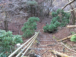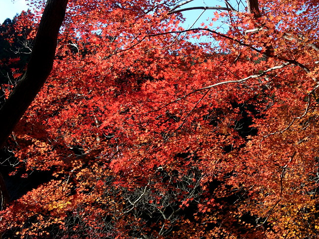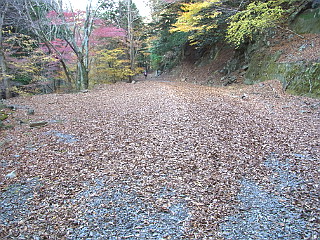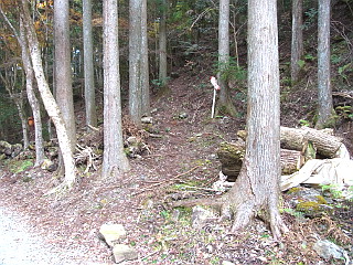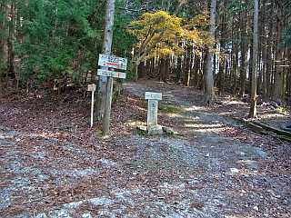 | 山行記 | ●くらがり渓谷から本宮山へ登るルートは、渓谷沿いの林道からだけだと思っていたが、山道を登るコースがあるということなので、行ってみることにした。平日の休みだが、妻も休みだと言うので、一緒に行くことになった。 ●登山口のくらがり渓谷は、豊川からは本宮山の反対側になるので、杣坂峠を越えて旧額田町に入る。一時期新東名の工事で大型ダンプが行き交っていた峠道は、2月13日の開通を前に、既に工事も終わっているらしくとても静かだ。 ●くらがり渓谷第1駐車場に着くが、やはり平日なので数台の車が停まっているだけだった。駐車場の周りの木々は紅葉真っ盛りで、朝の光を透過してまるで輝いているかのようだ。 ●車を停め支度をすると、早速くらがり渓谷入口のゲートを潜って林道を歩き始める。その名のとおりくらがり渓谷は9時を過ぎてもまだ日が差さず肌寒い。暗い渓谷沿いでは紅葉した木々が目を引く。 ●猿飛の岩を過ぎ、くらがり山荘辺りから左手に登山道入口を探しながら進む。最初は見落として少し先まで行ってしまったが、よく見ながら戻ってみると、山側に登る山道があり、「ハイキングコース」というしっかりとした案内まであった。 ●最初は沢に沿った急な山道を登る。いきなりの急登で大変だが、我慢してゆっくり登っていくと整備中の林道に出る。そこから左方向に少し林道を登ると、再び「ハイキングコース」の案内があるのでそれに従って右手の山道に取り付く。 ●入口は急だが、すぐに林道に沿った平坦な道に変わる。しばらく林道を見下ろしながら緩やかな山腹道を行くと、逆さまになった「ハイキングコース」の案内があるので、それにしたがって尾根を登り始める。 ●不規則なジグザグの急登は、見事な植林の中をひたすら登る。やがて尾根から外れ別の尾根を越えると再び山腹道を歩くようになる。道は所々狭くなっており、うっかり石を落とすとしばらく止まらない程急な斜面なので慎重に通過する。 ●しだいに前方が明るくなってくると、本宮山スカイラインに出る。平日ながら時折通過する車やバイクに気を付けながらスカイラインを渡り、スカイラインを離れて作手無線中継所へ続く舗装道を進む。 ●途中で無線中継所へ行く道と別れて「ハイキングコース」の案内のある方へ進む。道は途中で怪しくなってくるが、無線中継所の直下を過ぎるとはっきりした道になり、ガードパイプのある坂を下ると再びスカイラインに出る。 ●そこからしばらくスカイラインを歩くことになるが、歩道があるものの、木々が伸びていたり、枝葉が堆積していたりで、通行することができない箇所もあった。平日で車の往来も少ないが、車が速いスピードで通過するときは少し緊張した。 ●途中、何箇所か山道の入口のようなところがあり、幾つか登ってみたがあまり歩かれていないようで、すぐにスカイラインに戻るところが多かったが、丁目の彫られた石柱があったりするので、スカイラインができる前はそれが参道だったのであろう。 ●しばらく行くと、「ハイキングコース」の案内があるのでそれに従って山道に入る。ここからははっきりとしたいい道が続くが、倒木や壊れかけた木の階段などは、この道があまり歩かれていないということを物語っているようだ。 ●幾つかの鉄塔を過ぎさらに進むと旧ふるさと公園の広場に出る。広場からは本宮山山頂の鉄塔群を見ることができる。広場には不自然に思える程木々も無く、獣の白骨が散乱していて少し気味が悪い。 ●広場の外れから舗装道を歩き、「ハイキングコース」の案内に従って擬木の階段のある山道を下ると、いよいよ山頂への登りが始まる。道の真ん中がコンクリート舗装されているが、急で、しかも上部は倒木が道を塞ぎ、迂回を強いられる。 ●それでも何とか最後の一頑張りで一等三角点のある本宮山山頂に到着する。これまで一組の登山者にも出会っていなかったのに、そこでこの日初めて多くの登山者を見るのは不思議な感じだ。 ●本宮山山頂は南方面に展望が開けるが、やはり鉄塔や電線が邪魔ですっきりとした展望は得られない。風の当たらないベンチで食事をとった後下山を開始する。下山はくらがり渓谷へ続く林道を下りることにする。 ●山頂から鉄塔群の中の急な舗装道を下り、スカイラインを横断して駐車場の横から車止めのゲートを越えて林道を下る。ゲート付近に携帯電話各社の受信状況が書いてある案内坂があり、くらがり渓谷の観光案内所までの距離が書かれている。それによると、観光案内所まで6.9km、まだまだ先は長い。しかし、その案内板は0.3kmごとに立てられているのでいい目安になる。 ●樹林帯の暗い中、点々と現れる紅葉の木が日の光を透過して美しい。林道を下っていくと、山頂への急な近道や風頭山、西蔵方面との分岐となる馬の背平に着く。 ●馬の背平からくらがり沢に沿った林道をひたすら下る。暗くて単調な林道はさすがに嫌に