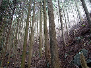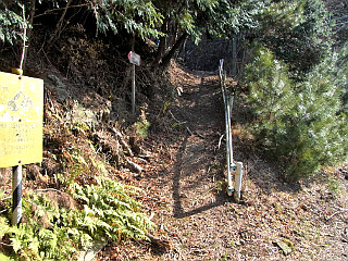 | 林道から再び山道へ | 逆さになった案内に従って尾根に取り付く | 尾根には植林が見事だ |