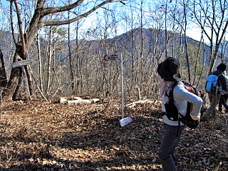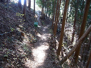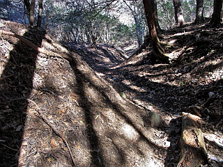 | 雑木林から掘割状の暗い登山道に変わる | 指導標に従って尾根に上がる | 落ち葉で滑りやすい急な尾根道を登る |