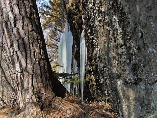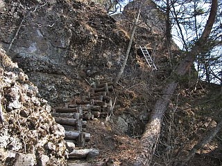 | 雪は無いが気温が低いため立派なつららが各所に残る | 木階段とその向こうにアルミの梯子 | |