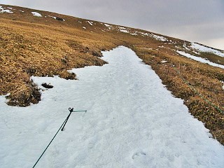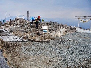 | 強風の中例年になく雪の少ない切るが峰の主峰に登る | ||
