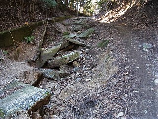 | 南善坊へ登る石段との分岐 | 分岐から見る琵琶湖方面 | かつては舗装されていたであろう道が無残だ |