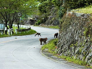 | 鳥川ホタルの里駐車場 | 舗装道を渡るサルの一家 | 小安堂登山口 |