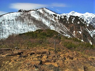 | 小遠見山山頂から見た鹿島槍ヶ岳 | 小遠見山山頂から見た五竜岳 | 雪の少ない尾根を下山する |