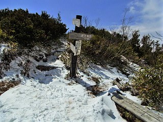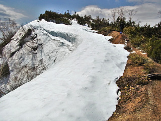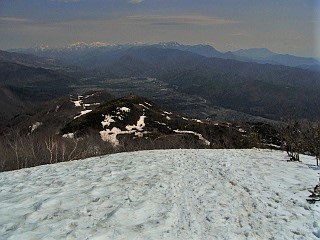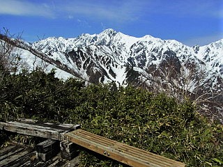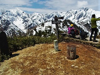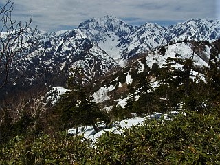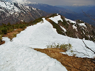 | 山行記 | ●前日は、季節外れの降雪を観測するなど、大荒れだった北アルプス一帯だが、この日は朝から後立山連峰の山々がくっきり見える。今回は、予定した小遠見山へは行くことができないかと思っていたが、これなら大丈夫そうだと、行ってみることにした。 ●栂池の民宿で早い朝食を済ませた後、テレキャビンの駅がある五竜とおみへ向かう。広い駐車場で支度をして、テレキャビンの列に並んだ頃、この日のテレキャビンの運行が始まった。 ●テレキャビンからも、五竜岳や白馬三山などが良く見えいい感じだ。テレキャビンを下りると、リフトに乗り換え、終点で降りる。ほとんどがスキーやスノーボードが目的の人達だが、登山客もちらほらと見られる。 ●リフト終点は、スキー場の部分だけは雪があるが、それ以外は地面が露出し、スノーシューで歩ける状態ではない。仕方がないので、スノーシューとストックを抱えて地蔵ノ頭へ登ることにした。 ●地蔵ノ頭からは、北アルプス後立山連峰稜線の山々が大迫力で迫り、背後には頚城山塊や戸隠連峰、飯縄山、四阿山、浅間山などを一望することができた。雪の無くなった斜面には、ショウジョウバカマやタテヤマリンドウなどが咲き始めていた。 ●地蔵ノ頭から下り、地蔵ノ池からの道と合流する辺りから登山道が雪に覆われてきたので、ここで初めてスノーシューを履くことにする。その先は急な雪の斜面で、トレースが錯綜する斜面を一気に登って尾根上に出る。 ●すぐに樹林帯を飛び出して、見返り坂という展望地に出る。その名のとおり、そこからは、これまで登って来た道や北信の山々を見渡すことができる。この辺りからも、所々地面や木の階段が露出した部分があるので、それを避けて雪のある部分を歩く。 ●一登りで一ノ背髪に着くが、広場には雪が無く、ベンチも見えていた。一ノ背髪からは、目的の小遠見山がぐっと近くに見え、五竜岳の五竜菱も一層はっきりと見ることができた。 ●一ノ背髪からは、斜度も一層急になり、尾根上の雪もナイフリッジ状に盛り上がった部分もあり、登りは何とか慎重に通過するが、下りは一層スリリングな、両側が切り立った細い急斜面で、スノーシューで下るのにはかなり苦労した。 ●二ノ背髪にも雪が無いが雪のある所をつなぎながら登る。二ノ背髪を過ぎた辺りからは鹿島槍ヶ岳の雄姿も見ることができ、小遠見山も間近に見える。斜面もこれまでと比べれば緩くなるが、尾根に積もった雪の縁を歩くので気が抜けない。 ●小遠見山と巻道との分岐の手前で、登山道の雪が無くなってしまったので、そこからはスノーシューを外し、手に持って咲きへ進む。小遠見山と巻道との分岐から再び雪道となるが、面倒なのでそのまま登ると目的の小遠見山の山頂に到着する。 ●小遠見山山頂の広場も完全に雪が消えており、抱えてきたスノーシューを置いて展望を楽しんだ。朝と思うと少し白く霞んできたが、後立山連峰の峰々は大迫力で、遠く槍ヶ岳や常念岳なども確認することができた。 ●外にも頸城山塊や北信の山々が見える外、虫倉山や聖山、戸隠の一夜山などの低山も確認ができ、いつまで眺めていても飽きないが、山々を包み込む雲もさらに増えてきたので、下山を開始することにした。 |