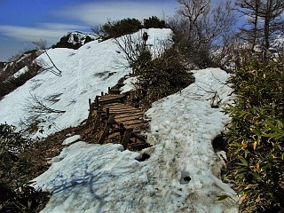 | 地蔵ノ池からの道と合流 | 見返り坂から見る北信の山々 | 木の階段が露出した部分もある |