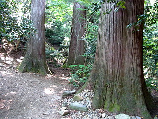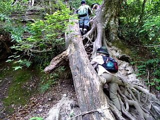 | 杉の大木が目立つ | 木の根の急坂が続く | 文殊堂下の大岩を登る |