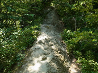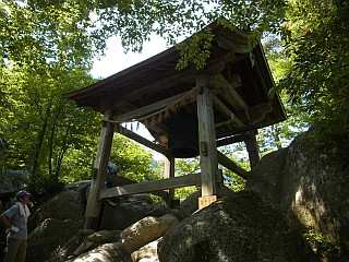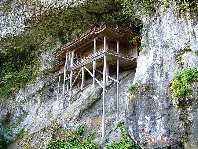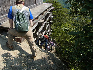 | 山行記 | ●三朝温泉旅行中日は目的の三徳山投入堂へ行く。ホテルの朝食を頂いた後、投入堂を目指す。ホテルからは十数分で三徳山駐車場に着く。駐車場にはトイレもあり、既に何台かの車が停まっていた。 ●駐車場からは、来た道を少し戻り、三徳山参道入口からステップの大きい急な石段を登る。それを登った所からさらに左へ上がる石段を登ると案内所に着く。そこから偕成院、正善院、輪光院、宝物殿を見ながら参道の石段を登っていくと三仏寺に着く。 ●三仏寺本堂の所に登山事務所があり、そこで入山料を払い、靴底の確認をする。登山事務所横のテントで、必ずつけるように言われた「六根清浄」の輪袈裟をかけていよいよ出発だ。 ●一旦階段を下った後、朱塗りの門の扉を開け、宿入橋を渡って山道を登り始める。大きなシライトソウを見ながら緩やかに登ると、早速木の根を攀じ登る急坂が現れる。山慣れしていない先行の団体が通過するのを待ってこちらも登るが、ステップもホールドも豊富で特に難しい個所ではない。 ●そういった箇所をいくつか通過すると、文殊堂が見えてきて、その梁の下は一枚岩の急な鎖場となっている。見た目よりもステップもしっかりしているが、少々鎖頼みの部分もある。 ●鎖場を登り切ると、文殊堂に着く。土足厳禁だが文殊堂を一周する縁側に上がることができる。微妙に外側に傾く縁側は緊張するが、周囲の景色が開け、気持ちがいい。 ●文殊堂の先は岩場が多くなり、すぐ上の地蔵堂に着く。地蔵堂も縁側に上がることができ、建物を一周することができる。縁側からは、文殊堂と同様に周囲の景色が開け、すぐ下の文殊堂の屋根も見ることができる。 ●次に現れるのが鐘楼で、実際に突くこともできるので、なかなか下まで行くのが大変だが、何とか辿り着いて鐘を一突きしてからさらに進む。 ●鐘楼からは、大岩がその名のとおり馬ノ背や牛ノ背状になった岩場が続く。さらに進むと大岩が覆い被さるように張り出した下に建つ納経堂とその先には観音堂が見えてくる。 ●観音堂は建物の裏を真っ暗な通路を通って進む。隣の元結掛堂の前を通り、岩を回り込むとようやく投入堂が見えてくる。手前には不動堂が立ち、どちらもどのようにしてこの建物を建てたのか不思議な感じだ。 ●投入堂には、不動堂の下ぐらいまでしか近寄ることができないが、これを建てるために岩をくり抜いたのかと思うぐらい岩の窪みにきれいに収まっている。 ●昔の人の技術の素晴らしさと情熱に思いを馳せながら、しばらくこの建造物を眺め、帰路に着く。帰路は、所々難しい個所がう回路になっており、意外にスムーズに下りることができた。 |