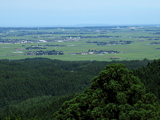| 羽黒山の三角点はこの上にある | 羽黒山レストハウス | 二の坂茶屋からの庄内平野と日本海、飛島 |