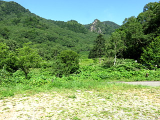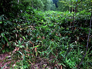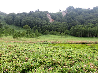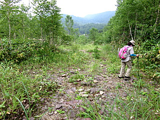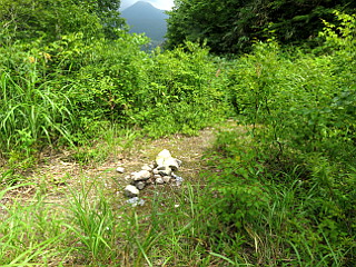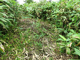 | 石の湯への下降点になる広場 | 背丈以上のササを掻き分けて進む | ようやくササが終わりリンドウ平に出る |