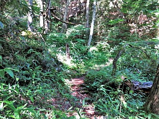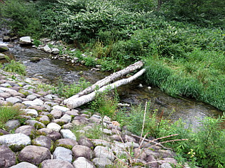 | リンドウ平から見る稜線 | リンドウ平から不明瞭な道を下る | 丸木橋を渡ると石の湯は近い |