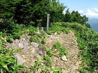 | 志賀高原の山々を展望する山頂とササに覆われた不明瞭な小坊寺山の道 | ||