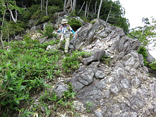 | 「70m沢登り」の標柱 | 南稜線に出る | 振り返ると横手山が見える |