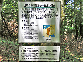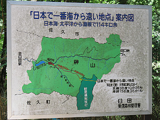 | 「海から遠い地点まで100m」標識 | 「日本で一番海から遠い地点」 | 「日本で一番海から遠い地点」看板 |
