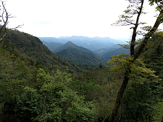 | 英彦山中岳山頂の英彦山神社上宮 | 吊尾根の鞍部付近から見る英彦山南岳 | 吊尾根から見る山並 |