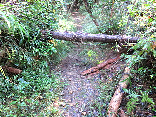 | 「おすすめの小径」入口 | 東屋から見る吉祥山と本宮山 | この倒木は意外に越えるのが大変 |
