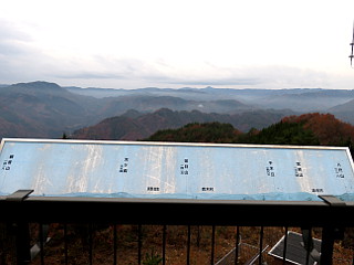 | 山行記 | ●前亀沢山の帰りに国道151号線を走っていたら、「弁当山公園入口」という看板が目に入った。弁当山は、前亀沢山と同じく「信州ふるさと120山」で取り上げられた山で、この日、前亀沢山と組み合わせて登る候補の山だった。 ●しかし、前亀沢山の後温泉に入ってしまったので、汗をかかない程度に登ることができればいいが、そうでなければ、登山口だけ確認できればと思い、看板の示す道に入ってみることにした。 ●しばらくは、集落の中の舗装道が続き、分岐毎に案内看板があるのでそれが示す方向に進む。集落を離れると道は一段と狭くなり、舗装の傷んだ落ち葉の積もる怪しい道になる。 ●あまり怪しくなるようなら引き返そうと転回場所を探すが、なかなか無く。車1台がかろうじて通ることのできる道を不安を抱えながら進む。カーナビでは既に道が載っていないが、弁当山山頂が近付いてくるのがわかるのでそのまま登っていくと、「信州ふるさと120山」に写真が載っている大きな展望台が見えてきた。結局山頂まで来てしまったようだ。 ●車を停めると、早速展望台に上ってみる。展望台には展望案内坂があり、中央アルプスや南アルプスの主要山岳がずらりと並んでいるが、仙丈ヶ岳以外は雲があってよく見ることができない。 ●反対側にも展望案内板があり、八尺山や天ヶ森などの聞きなれない近くの山の向こうには茶臼山や蛇峠山などのお馴染みの山名も登場する。展望台周辺の紅葉はカラマツを始めいい感じに色付いている。 ●山頂付近には、トイレや東屋なども幾つか建てられているが荒れた感じだ。今回展望が今一つだったし、また来てみたい山だが、狭く荒れた林道を車で上がるのはもう勘弁なので、次回は是非下から歩いて登りたいと思いながら山頂を後にした。 |