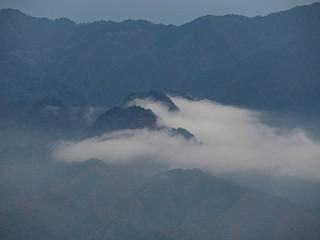 | ガスで包み込まれる山肌 | 山頂の紅葉はいい感じ | 山頂周辺には東屋などが建つ |