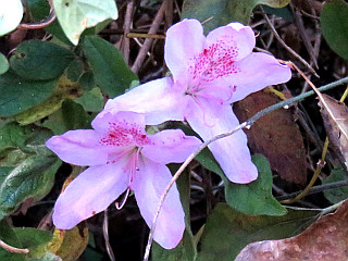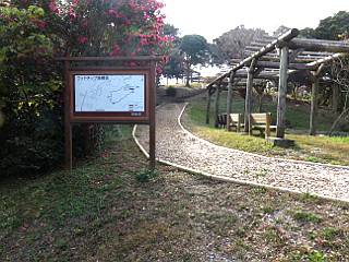 | 山行記 | ●この日2山目、通算9山目の渥美半島10名山は右善坊山。赤羽根西山から渥美半島をさらに西に進み、登山口の渥美運動公園へ向かう。渥美運動公園に着いたものの、至る所に駐車場があり、どこに止めていいのかわからない。 ●案内図を見ながら、皿焼古窯館の下にある広い駐車場に車を停めた。駐車場を出るとすぐに、レクリェーション広場入口があったのでそれを登ってみることにした。綺麗にコンクリート舗装された道を緩やかに登っていく。 ●コンクリートの道は、ウッドチップが敷き詰められた気持ちのいい道に変わり、道が突き当たると、レクリェーション広場方面と展望台方面に分岐するので、ここは左のレクリェーション広場方面へ進む。 ●ウッドチップが敷き詰められた道は緩やかにジグザグを切って続き、やがて、トイレや藤棚の休憩所のあるレクリェーション広場に着く。広場は、植栽されたサザンカやツバキが咲いていて見事だ。 ●レクリェーション広場から展望台方面に向かうが、ウッドチップで整備された道が続き、山ごと平地の公園のようだ。ツバキが咲き競う中、幾つもの分岐を通り過ぎ、緩やかな道を進むと立派な展望台が見えてくる。 ●この展望台のある高みが、右善坊山山頂のようで、展望台の近くには三角点と思われる標柱もある。早速展望台に登ってみると、越戸大山や雨乞山、目を転じれば、城山の向こうに伊良湖ビューホテルや神島などを見渡すことができる。 ●山頂からは、野球場方面とテニスコート方面に道が分かれるが、ここは野球場方面に下る。ウッドチップの道はさらに続き、途中ベンチなどもあり、やがて先程の分岐に着く。後は同じ道を下り、車を置いた駐車場に戻った。 |