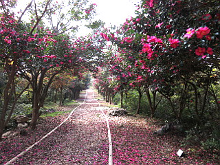 | 植栽のツバキが咲く園路 | 立派な展望台がある右善坊山山頂 | 展望台から見る雨乞山方面 |