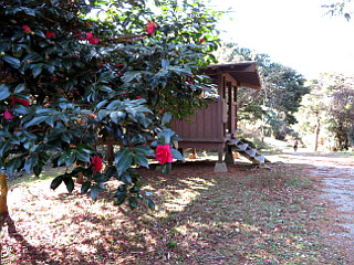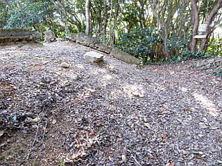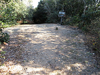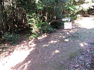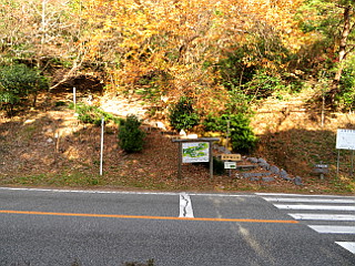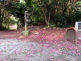 | 滝頭公園駐車場と衣笠山 | 衣笠自然歩道小衣笠の道入口 | ツバキの花びらが散る松尾岩コース入口 |