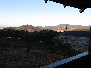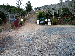 | 日の出とともに赤みがさす吉祥山と本宮山 | 「おすすめの小径」入口 | 東屋から見るまだ赤い吉祥山と本宮山 |