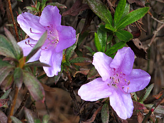 | レンゲツツジの小径入口 | 五葉湖堰堤から見る吉祥山 | もはや冬でも咲くのが当たり前のようなモチツツジ |