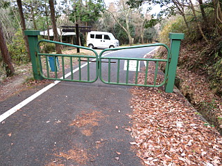 | 五葉湖駐車場と夕焼けの小径入口 | 東屋がある舗装道出合と車止めゲート | 宇利峠・蛇穴と五葉城址分岐 |