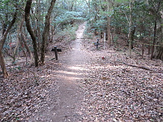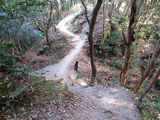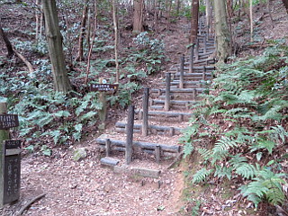 | 県境稜線下の急な階段 | 県境稜線 | 展望地から見る県境稜線と渥美の山々 |