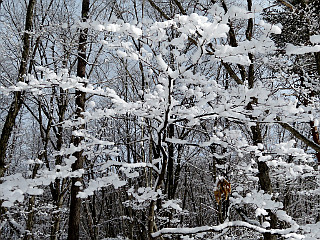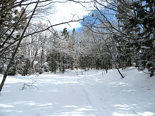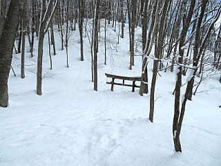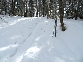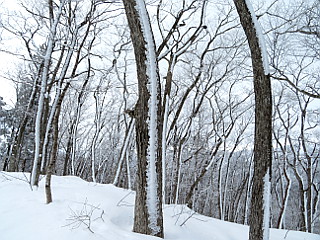 | 山行記 | ●この日は最終日なので、軽く歩いて帰ろうと、宿泊した民宿からも近くにある落倉浅間山に登って帰ることにした。栂池高原は前日からの雪で、車が雪と凍った雪ですぐには出発できず、解氷スプレーで氷を落としてからの出発となった。 ●宿から浅間山登山口までは10分足らずのところにある。それでも、うまく除雪がされていないと車を置くところが無いのだが、今回は車が置ける感じで除雪されていたため、そこに置くことができた。 ●登山口の林道の積雪は2m近くあり、最初除雪された路面から林道上に登ることができないのではないかと思ったが、横に登った跡があったので、それを辿って何とか林道上に上がることができた。 ●林道上には、あまり新しくないスノーシューのものと思われるトレースが幾つかあったので、それを辿って緩やかな林道を登っていく。 ●日が上がるに従って気温が上昇しているらしく、木々の枝に積もった雪が、盛んに雪の積もった林道上に落ちてくる。林道の雪は固めだが、トレースを外すと足をとられる。 ●気持ちよく、林道に沿って折り返しながら登っていくと、やがて林道終点に着く。林道終点は広場になっているが、雪が多いので、気が付かないうちに到着していた。 ●そこから落倉バックカントリーフィールドの小さな赤い標識を目印に山道に入る。少し緩やかに登ると、落倉バックカントリーフィールドの案内図が描かれた大きな看板があり、そこが三角点方面と山頂方面との分岐になっている。 ●今回は三角点はパスして山頂方面へ向かう。道は少し緩やかに登った後少し下り、平坦な道を歩いていくと、鳥居が現れる。鳥居は、前回と違ってかなり雪に埋っていて、潜ることは難しそうだ。すると、突然ホンドリスが現れ目の前を疾走していった。 ●鳥居の前で一礼して、その横を抜けて山頂への急な上りに取り付く。雪が無ければ階段で登るこの坂はかなり急だが、上りはスノーシューをヒールアップして何とか直線的に登ることができた。 ●急な斜面を登り切ると、浅間山山頂の一角に出て、傾斜も緩くなる。すぐに山頂の祠が見えるはずだが、雪が多いため見ることができず、それを囲っている石垣も雪の下で、そのあたりだけが窪んでいる。 ●山頂では霧氷が見られとても美しい。木々の間からは、上部が霧氷に覆われた周囲の山が白く輝き、栂池高原スキー場も見ることができた。少しの間霧氷と木々の間からの展望を楽しんだ後、来た道を戻った |