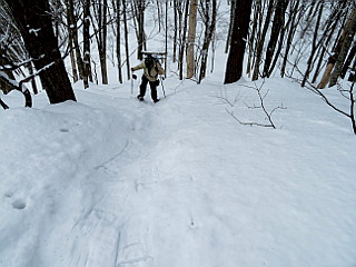 | まず2m近く雪が積もった林道まで上がる | 林道終点の広場 | 林道終点から山道に入る |
