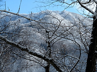 | 雪の付き方も面白い | 山頂付近から見た霧氷で覆われた山肌 | 帰りの林道から見た八方尾根 |