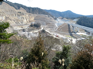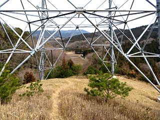 | 下山途中に見る採石場と新東名高速道 | 地面が割れているところもある | 送電線鉄塔 |