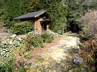 | 名柄バス停のある所が八鬼山越えの入口 | トイレのある名柄一里塚 | 木の橋を渡って山道に入る |