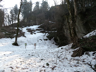 | あじさい茶屋 | 馬場の先がツナギガヤ自生地への分岐 | まだ多く雪が残る石切場 |