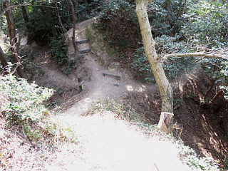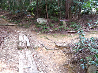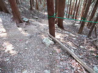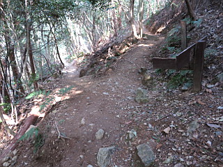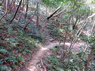 | 一等三角点のある神石山山頂 | 舟形のコルから巻道に入る | 巻道は稜線への階段下に出る |
