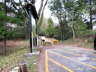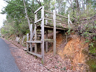 | 戦国ガイドステーション駐車場 | 林道伊部線入口 | 出丸登り口の木の階段 |