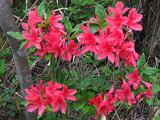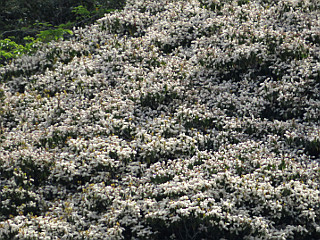 | 山行記 | ●ゴールデンウイークの最中、道路の混みそうなこの時期は、遠出せず近場へ行くことにしている。いつも山へ行く仲間も、もう一度このコースを案内してほしいというので出かけることにした。 ●近場へ行くときは7時出発、車を停める比丘尼駐車場までは30分ぐらいで着く。この時間、下に1台路駐している外は車は無い。やはりここが混み合うのはサクラに季節だけなのだろうか。 ●支度を済ますと駐車場の一角にある登山口から登り始める。東屋までの間は、カマツカが花を咲かせていた外は、それ程花は見られなかったが、途中のいつもカザグルマを見るところでは、遠くで白い大きな花をいくつか咲かせているのが見えた。 ●東屋から宇利城址にかけては、ヒメハギやキンランの見られるところだが、よく開いていないものが多かった。その先の愛の鐘を一鳴らしし、おすすめの小径から外れて金山へ向かう。 ●日当たりのいいところでは、ハルリンドウがまとまって咲いており、その先の樹林帯には、ハナイカダやツクバネウツギが咲いている外、シソバタツナミの特徴的な葉も見ることができた。 ●林道を横切り、金山へのジグザグの登りを登る。ミヤマナルコユリは花が咲きかけており、ギンリョウソウも1つだが見つけることができた。 ●金山山頂の刈り掃われたフェンスの向こうは、フェンスの外側を歩くことができたので、行ってみたが、見違える程よく木々が刈られ、吉祥山や本宮山、富岡の街などを見ることができた。 ●金山山頂からは県境稜線を歩いて雨生山を目指す。この日の天気予報は曇りで午後から雨ということで、県境の樹林帯は薄暗いが、それでも時折日が差したりと、なんともはっきりしない。薄暗い中ではコバノガマズミやツクバネウツギの白い花が目立つ。 ●裸地に出ると、ハルリンドウが無数に咲いていて、遠くからでも咲いているのがよくわかる。花付きのいいツクバネウツギもよく目立っていた。新城方面への下降点を見送り、展望のいいピークへ登るが、やはりツクバネウツギとハルリンドウが目立つ。 ●展望のいいピークから一旦下り、雨生山へ向かうが、下に見える東名高速道路は思ったよりも混んでおらず、むしろ、普段の土日や休日よりも少ないような気がした。 ●よく刈り掃われた雨生山に着くと、しばらく休憩をした後一旦展望ピークまで戻り、雨生山反射坂まで下る。この辺りから新城方面への下山道との合流点までのハルリンドウなどはまだ早いようだった。 ●合流点からの下りにはハルリンドウが無数に咲き、気を付けないと踏んでしまいそうな程だ。また、相変わらず道の両側にはツクバネウツギやコバノガマズミが元気だ。 ●しばらく下ると林道と合流するが、そこからしばらくはその林道を緩やかに下る。林道沿いには、ヤマフジやウマノアシガタ、コバノガマズミ、既に盛りを過ぎたチゴユリなどを見ることができた。 ●鉄塔入口の標識に従い山道を登ると、再びおすすめの小径に合流する。上部のそれとは若干趣の異なった裸地を抜け、最後の滑りやすい急な下りを下り切ればおすすめの小径の西登山口だ。 ●ここからは、いろいろな花の咲く農道を歩いて、車を置いた比丘尼駐車場まで戻るわけだが、ハルリンドウやキンラン、ツクバネウツギ、コバノガマズミなど、春の花を堪能した、ゴールデンウイーク中のいい半日山行となった。 |