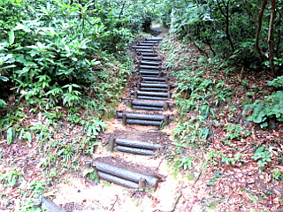 | 保久礼登山口駐車場 | 林道出合 | 擬木の階段が延々と続く |