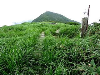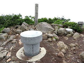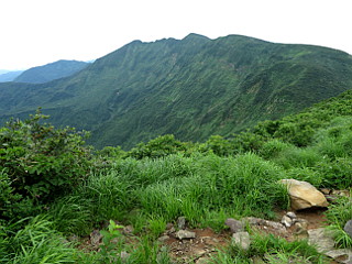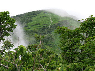 | 山行記 | ●新潟山行2日目は、守門岳。メンバーがボリュームがありそうなこの山をパスしたので、単独行になった。長岡のホテルを5時頃出て6時頃には保久礼登山口にある駐車場に着いたが、他の車はまだ停まっていなかった。 ●後からわかったのだが、ここが保久礼小屋手前の駐車場だと勘違いしており、保久礼小屋手前の駐車場はこの道をまだ3km程上ったところにあり、コースタイムにして往復50分余分に歩いたようだ。 ●支度を済ますと、案内に従って歩き始める。つい今しがたまで雨が降っていたようで、広い林道のような登山道の刈られたばかりの草が濡れているので、この日もスパッツを付けることにする。道には水たまりも多く嫌な感じだ。 ●広い林道は、広場から普通の登山道に変わり、大きくジグザグを切って登っていくと、林道に出る。林道を行くと保久礼小屋があるということだが、ここは、そこから折り返して続く山道を登ることにする。 ●山道は、左から上ってくる擬木の階段の道と合流するが、この道は、保久礼小屋の方から上ってくる道なのだろう。急な階段は途切れ途切れではあるが、感心するほど延々と続く。 ●第一展望台を経ると階段が終わるが、粘土質の滑りやすい道に変わると、その先でキビタキ小屋への分岐に出る。キビタキ小屋はパスしてそのまま急坂を登っていくと、キビタキ小屋からの道と合流する。 ●粘土質の滑りやすい道は、雨水で削られて真ん中が深く削られ、さらに歩きにくくなっている。第二展望台の辺りから木々の高さも低くなり、明るく周囲の展望も得られるようになるが、ガスがかかってどこが見えているのかはわからない。 ●キビタキ清水の分岐を過ぎ不動平と徐々に傾斜が緩くなり、やがて大岳の山頂に到着する。大岳山頂は岩の多い広場になっていて、三角点や巣守神社が祀られている。これから向かう守門岳山頂もここまで来て初めて見ることができるが、まだまだ遠い。 ●大岳からは、ここまで見ることのできなかった、オニアザミやアオヤギソウ、ニッコウキスゲ、アカバナシモツケソウなどが咲くお花畑の中を下る。帰りの登り返しが心配になる程一旦下り鞍部に出ると、後はそれと同じぐらいの登り返しが始まる。 ●何段階かで登り返していくと、二口コースとの合流点に出る。木道が現れると青雲岳は近い。青雲岳の山頂には地塘があり、イワイチョウやモウセンゴケなどの花を見ることができた。 ●ここまで来れば目的地はもう近く、僅かに下り緩やかに登り返せば守門岳山頂の袴岳に到着だ。本来なら360度の大展望が得られるところだが、残念ながらガスに包まれ見ることはできない。しかし、むしろこの天気なら雨に降られないだけでもいい。 ●山頂で少しゆっくりした後下山にかかる。下山も、粘土質の道は滑りやすいので気は抜けないが、ひたすら来た道を下る。下山してから、かなりコースタイムをオーバーしてしまったと思っていたが、結局それ程のオーバーでもなかったようで一安心した。 |