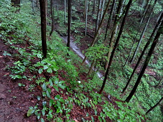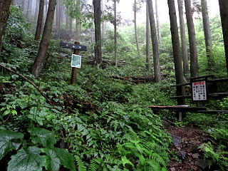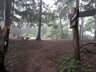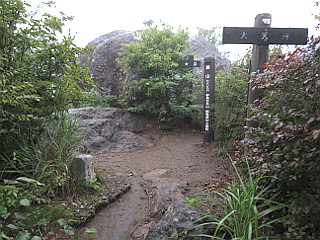 | 山行記 | ●最近、日本百低山が気になりだしたところで、今回は、草津温泉をベースに群馬の山を登ろうと考えた。まず向かうのは嵩山、登山口が道の駅なので安心だ。 ●しかし、このところ毎日どこかでゲリラ豪雨があり、洪水や土砂崩れの報道が流れている。この夜も、須坂でゲリラ豪雨があってその方面への道は通行止めになっていた。 ●上田で高速を下り、国道を群馬県の中之条へ向かうが、道に流れ出した土砂が目立つ。さらに進むと警官に止められ、その先で土砂崩れがあって通行止めになっているという。仕方がないので、その警官に迂回路を聞き、そのとおり進む。 ●当初から天気予報は芳しくなく、最悪、温泉旅行で終わってしまうのか、などと思いながら自宅を出たが、なんとか予定していた道の駅まで着くことができ、そこで仮眠をする。 ●夜雨が降り、これでは山は無理かと思ったが、朝には雨が止んでいたので、濡れを防ぐため合羽のズボンだけ履いて出発した。短い行程の山だが、いつ雨が降るのかわからないので、東登山口から最短コースで山頂の大天狗を往復することにした。 ●東登山口へは道の駅の建物の前を右に続く舗装道を歩いていく。登山口から階段を登り、鳥居を潜って山道を登る。濡れた草がややうるさい道を登っていくと樹林帯に入る。 ●滑滝やスカイツリーと同じ標高の看板などを見ながら薄暗い登山道を登っていくと、胎内くぐりの分岐に出る。とにかく山頂を踏みたいので、そこは山頂の大天狗方面へ進む。 ●その先で胎内くぐりからの道と合流すると、階段が現れるのでそれを登っていく。すぐに五合目の標識が現れ、右手に岩壁が見えるようになる。さらに登り七合目の標識を見ると、程無く経塚と呼ばれる東屋のある広場に出る。 ●経塚は小天狗方面と山頂の大天狗方面への分岐になるので、大天狗方面へ進む。すぐに長い鎖のある岩場が始まるが、足をかけるところも少なく、加えて雨で岩が濡れていて滑りやすいのでなかなか手強い。 ●意外に長い岩場を登り切ると、大天狗と呼ばれる嵩山の山頂に着く。山頂には大岩という大石があるので、それにも登ってみるが、周囲はガスで真っ白で何も見えないので、大岩の上の祠にお参りをして下山にかかる。 ●経塚まで来たところで、中天狗、小天狗方面を周回しようと思い、一旦向かいかけたが、いつ雨が降るかわからない天気なので、結局来た道を戻ることにした。 |