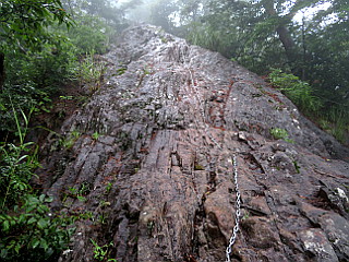 | 鎖が付けられた濡れた岩場を登る | 嵩山最高点の大天狗 | 大天狗山頂の祠 |