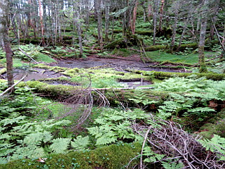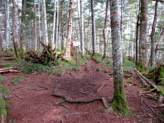 | 山行記 | ●一週間前この山を目指したが、悪天の予報で、尾高山までで折り返したところだ。しかし、登り残すのは気持ちが悪いので、この日再挑戦となった。先週とほぼ同じ時間に豊川を出て、やはり、7時過ぎにしらびそ峠に到着した。 ●この日は、晴れているが、南アルプスは稜線が雲を被り見ることができない。それでも、雨に降られるよりいい。早速支度を済ますと、先週と同じく尾高山登山口から登り始める。 ●よくササの刈りこまれた痩せ尾根の急登はしばらく続き、「尾高山山頂まで2.0km」の標識が現れる辺りから、広い急なシラビソとササの尾根を登るようになる。やがて道が緩くなると前尾高山に到着する。 ●広すぎて山頂らしくない前尾高山山頂のすぐ先に「尾高山山頂まで1.5km」の標識があり、道は下りに変わる。やや急な坂を下り切ると緩やかなアップダウンがしばらく続き、「尾高山山頂まで0.5km」の標識辺りから尾高山への登りに取り付く。 ●岩場が現れると、すぐに尾高山の山頂に着く。尾高山の山頂には広場があり、展望所もあるがやはり南アルプスの稜線付近は厚い雲がかかり見ることはできなかった。 ●山頂一画には「奥茶臼山5.1km」の標識があるが、目的の奥茶臼山まではまだまだ遠いということがよくわかる。尾高山からはやや険しい岩の混じる急坂を下る。その後は、コケとシダとシラビソの緑が美しい森の中をアップダウンをしながら進む。 ●すこしまとまった登りを登り、傾斜が緩やかになると奥尾高山山頂に着く。山頂といっても展望があるわけでもなく、消えかけた標識が無ければ通り過ぎてしまいそうだ。 ●奥尾高山から一旦下り、少し登り返した後は緩やかなアップダウンが繰り返す。倒木も多く、古い倒木は苔むし、それを縫うように道は蛇行している。やがて、ぬた場が現れるが、そのすぐ先に「奥茶臼山3.0km」の標識が現れる。 ●後は一登りで岩本山の山頂に到着する。ここも、展望も無く広くも無く山頂らしくない山頂だ。周囲の樹林には、山の深さを感じさせるサルオガセが着いている。 ●岩本山から僅かに下ると、小ピークを越えて緩やかに登る。倒木が多くなり、疎らなシラビソの樹林と幼木の育つ明るい広場からは奥茶臼山の山頂部が見えた。 ●オトギリソウやキオンが目立つ縞枯れのような斜面を登り、最後の急登を登ると道は平坦になり、さらに進むと目的の奥茶臼山の山頂に着く。奥茶臼山山頂も狭く樹林に囲まれ、展望の無い地味な山頂だ。 ●思ったより早く山頂に着くことができたので、少しゆっくりしてから下山にかかる。下山は、来た道を戻るが、帰りもアップダウンが多いのがこのコースの特徴なので、焦らずゆっくりと下ることにした。 |