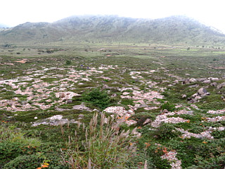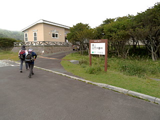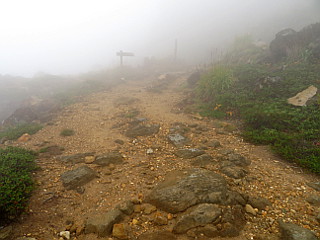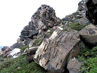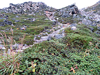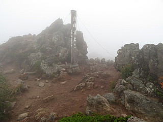 | 山行記 | ●北海道遠征この日の2山目は恵山。気持ちよく晴れた渡島駒ヶ岳から下山した後、恵山登山口の火口原駐車場へ向かうが、あれだけ晴れた天気も、急変して雨模様の天気へと変わってきた。 ●登山口駐車場で管理の人が午後3半頃から雷を伴った強い雨が降るという。実際今にも雨が降りそうな空模様で、どうしようか迷ったが、往復2時間の山なので、今から登っても午後3時半までには下山できると思い、雨を覚悟で登ることにした。 ●最初は賽の河原へ続く舗装された遊歩道を歩く。左手にはその名のとおりの賽ノ河原が広がり、右手には、荒々しく各所で水蒸気が上がる、駒ヶ岳とはまた違った火山らしい山肌が見える。 ●少し行くと権現堂登山コース入口があるので、案内に従って右へ続く山道を登る。岩肌は、溶岩が冷えた時に空気が抜けた後のような独特な模様が面白く、所々に硫黄が噴き出したような黄色く染まった岩などがあり、火山であることがよくわかる。 ●登山道には、山頂までの距離が書かれており、いい目安になるが、「恵山登山コース1979m」や「恵山山頂まで730m」、「恵山山頂まで230m」など細かく刻む意味はよくわからない。 ●山頂が近付くにつれ、天候は見る見る悪くなり、最初は賽ノ河原の周りの山や、海などが見ていたが、しだいにガスに包まれてきて、少し先も見えない状態に変わってきた。 ●「恵山山頂まで100m」の標識を見ると恵山山頂はすぐだが、山頂は登山道から少し右手に入ったところにあるので、ガスが濃く、最初は通過してしまいそうになった。 ●本来ならこの山頂から展望が広がるはずなのだが、このガスでは望むべくもなく、それより雨が降り始めるまでに下山したいので、急ぎ足で下山を始めた。 ●下山後麓へ下るとまだ晴れ間の見える状態で、結局、ガスに包まれていたのは恵山の山頂部のみだったようだった。そして雷を伴い激しく雨が降ったのは、函館の居酒屋で宴会をしていた時だけだった。 |